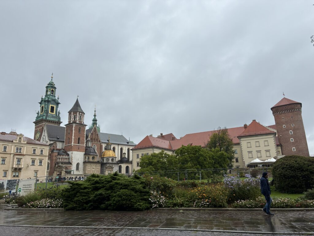 10:30にチェックアウト後に、ヴァヴェル城に行ってみました。旧市街の南端にあるお城で、歩いて行けます。が、小雨が降っていて寒くてややきつかったです。ここは歴代のポーランド王の居城ですが、戦時中はポーランドはオーストリアやドイツに占領されていたため軍の司令部の役割を果たしたそうです。疲れていましたし、似たようなところをたくさんみてきたこと、入場にお金がかかり、しかも時間が決められていることなどから、無料で回れる外側からだけみてまわりました。それでも十分楽しめました。