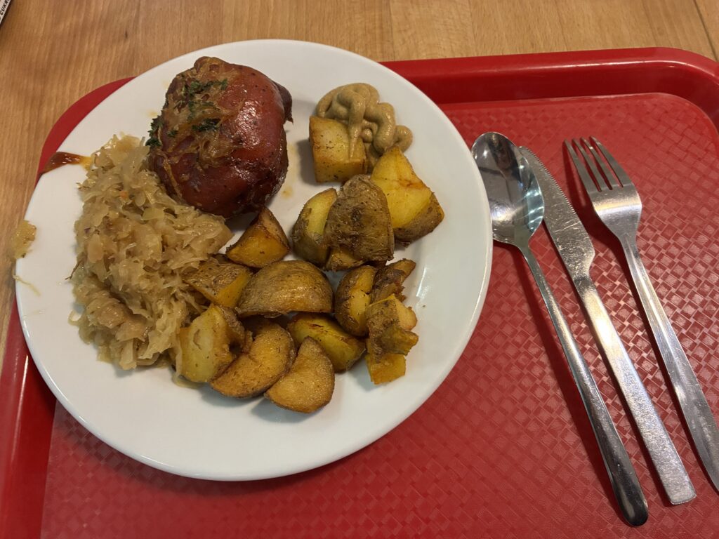 その後、旧市街のお土産屋さんを見てまわりました。子供のお土産にポーランドのお菓子を買いました。これは自分の好きなお菓子を入れて、重さでお金を払う仕組みです。あと、ドイツ産のフォークセットがあったのですが、キノコの形をしていて可愛かったのでこれにしました。両方とも30〜40plnと1500〜2000円くらいです。お昼は、フードコートが混んでいたので駅の食堂で食べました。ポーランドのご飯は何を食べても美味しいです。