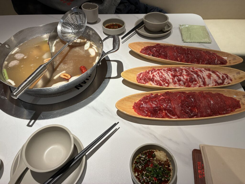 近くのテナントビルでお昼を食べることにしました。もうひとしきり食べたいものは食べられたので、今回は火鍋を食べることにしました。お店選びに時間をかけてしまいましたが、手頃なお店に入って鍋を頼みました。ここは野菜食べ放題を選ぶことができます。お肉は牛肉を3種類選びました。鍋だけにとりあえず美味しいです。野菜がたくさん食べられたのは良かったし、店員さんが非常に親切で、いろいろ助けてくれました。